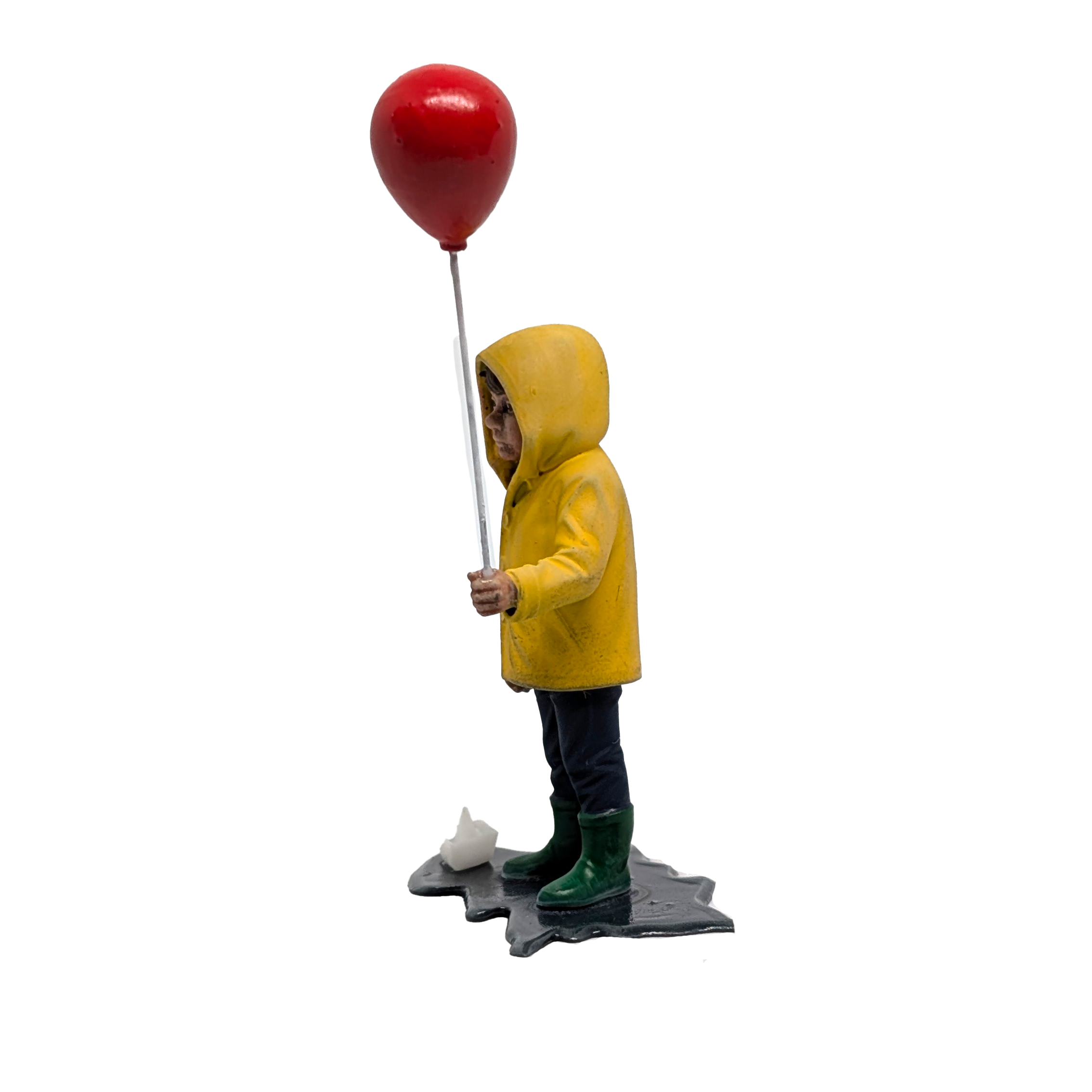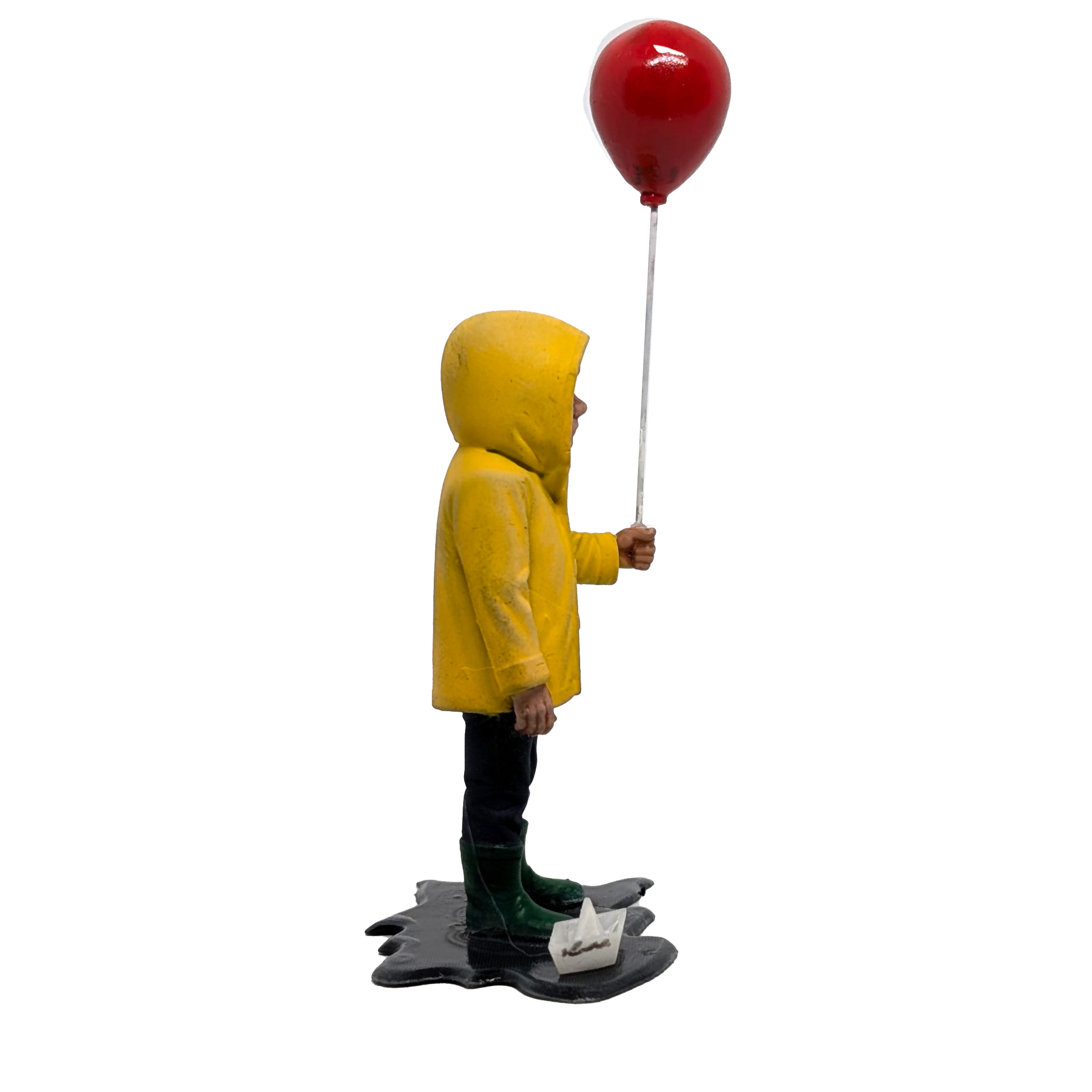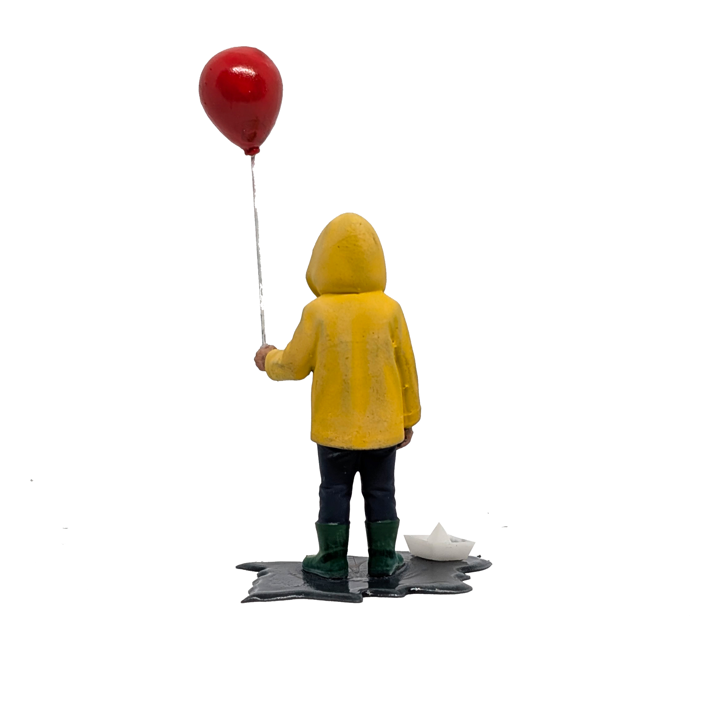 Your village just got a little more tragic. This hand-painted Georgie stands in his yellow raincoat and boots, clutching a red balloon over a tiny puddle—right before the storm takes a turn.